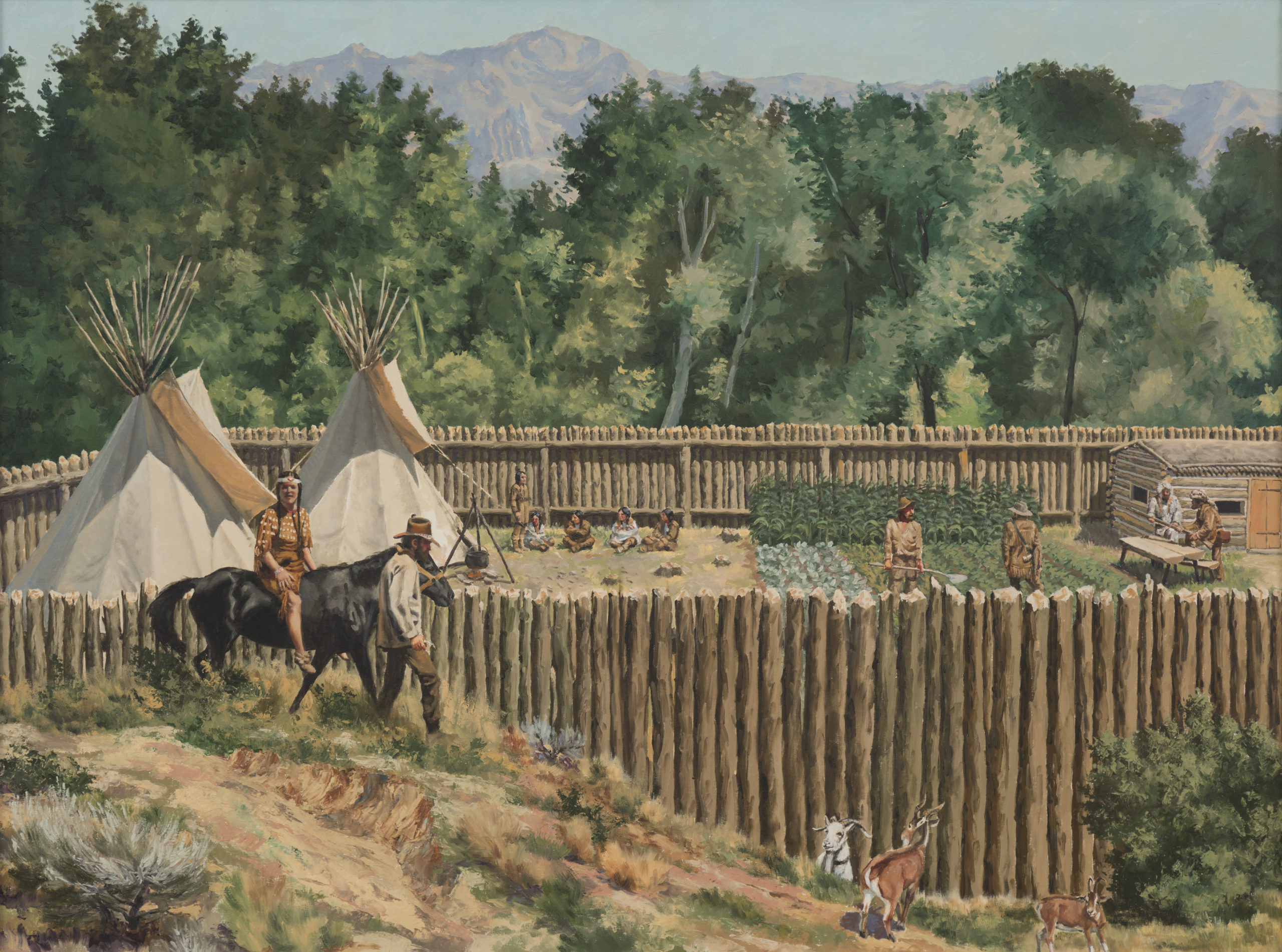 This painting features Native Americans and settlers living in Fort Buenaventura, located in present-day Ogden. In the foreground is Pomona, a Ute woman, sitting on a horse led by a man assumed to be her husband, Miles Goodyear, responsible for building the Fort in 1845.