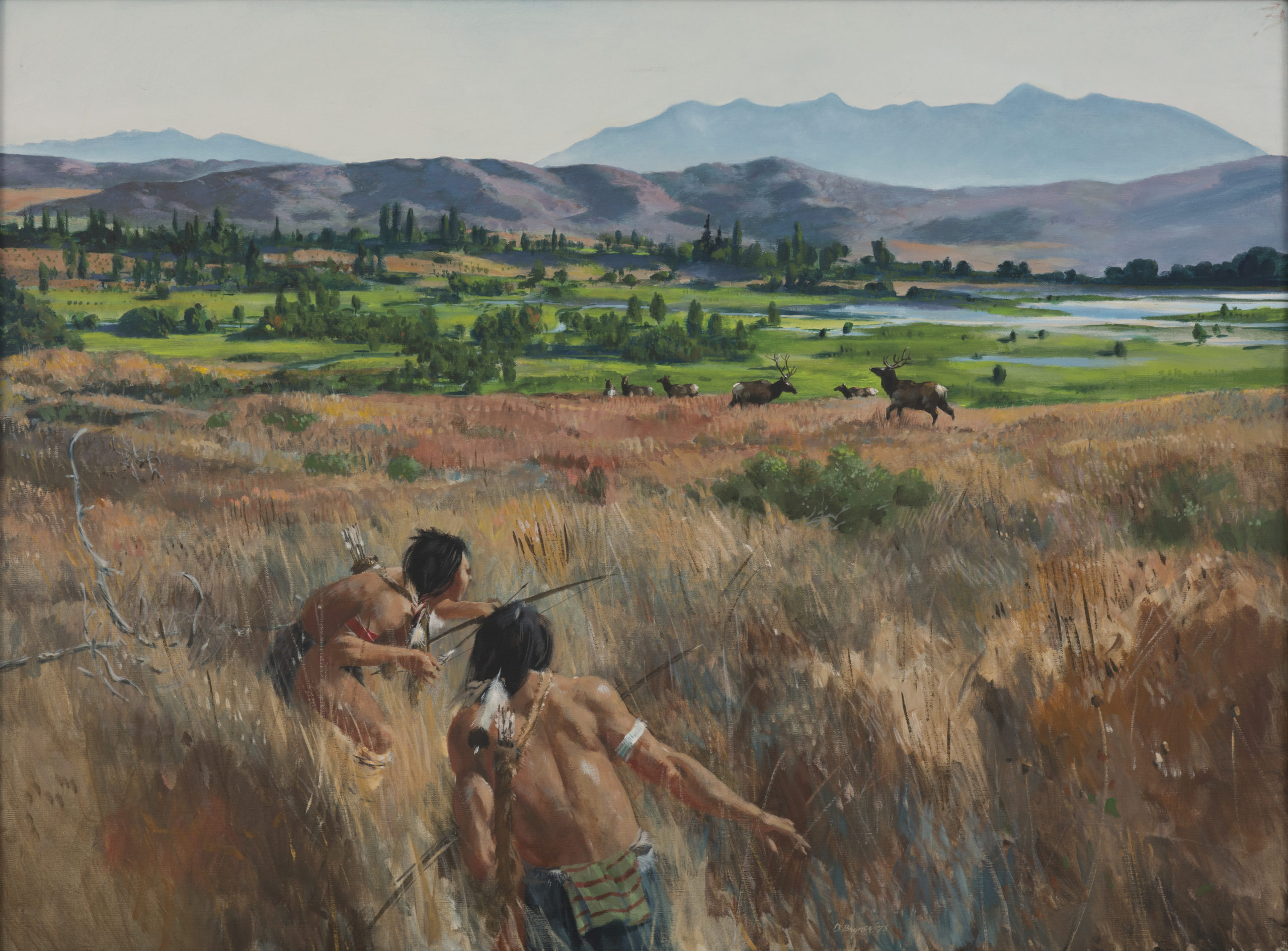 This painting by Bryner depicts a band of Native Americans hunting elk in the valley as well as illustrating the plant life native to the mountain valleys.