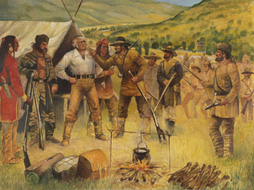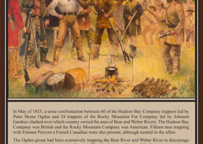 Nearly sixty members of the British Hudson’s Bay Company under well-known trader Peter Skene Ogden, approximately two dozen American Rocky Mountain Fur Company trappers led by Johson Gardner, and a neutral company of fifteen men trapping with the French-Canadian Etienne Provost gathered at the site. Ogden’s brigade was intensively trapping beavers along the Bear and Weber rivers to create a “fur desert” in order to discourage American territorial interest in the region, and it had amassed a sizeable fortune in furs estimated at $75,000 or more. Gardner and his competing American trappers, who were on their way to the annual rendezvous in Green River, Wyoming, believed Ogden and the British were trespassing on United States sovereign soil and provocatively set up their camp less than 100 yards away and hoisted the American flag.