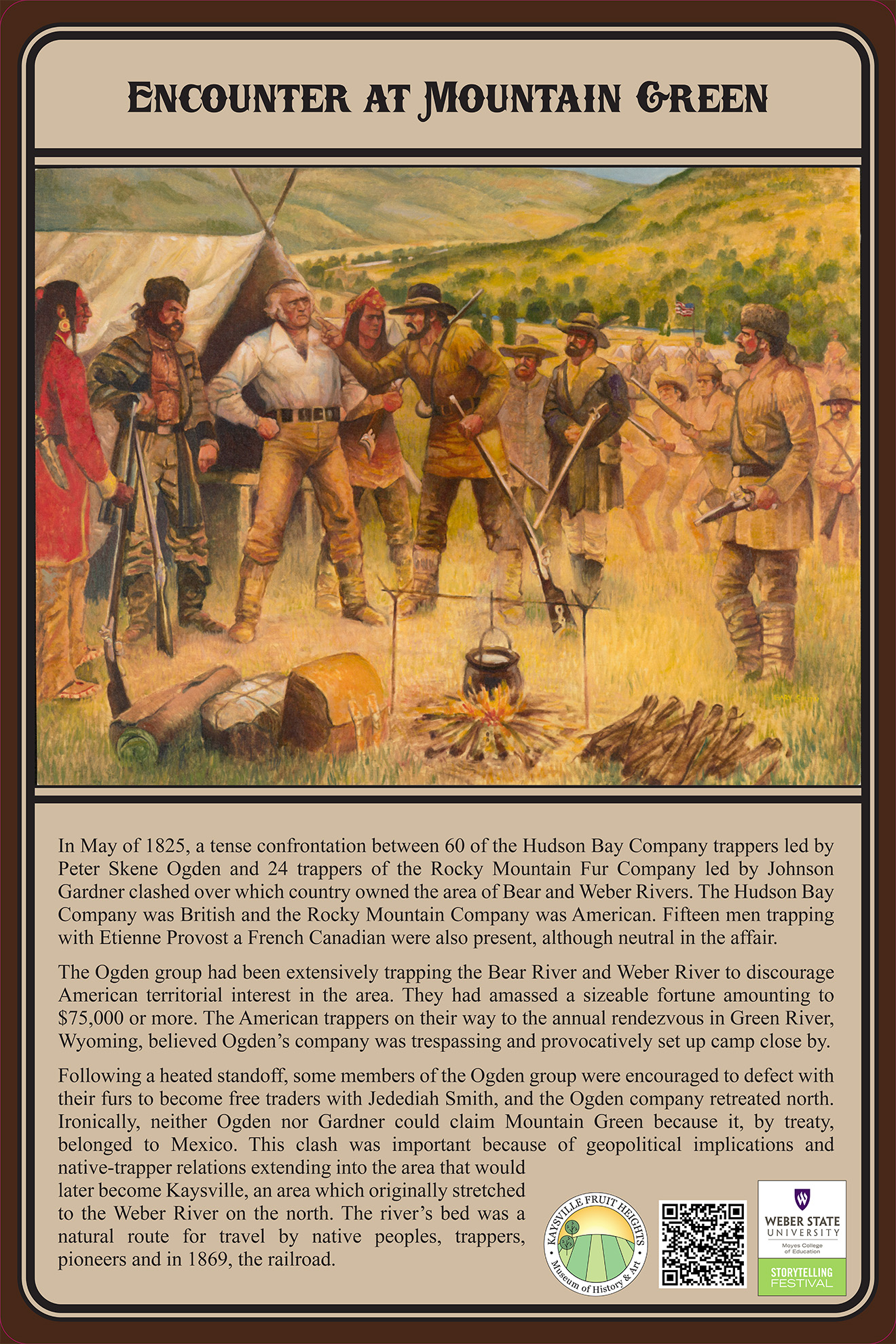 - The painting, Encounter at Mountain Green created by Gary E. Smith and commissioned for the nation’s bicentennial, is owned by the Weber State Storytelling Festival and shown by permission.