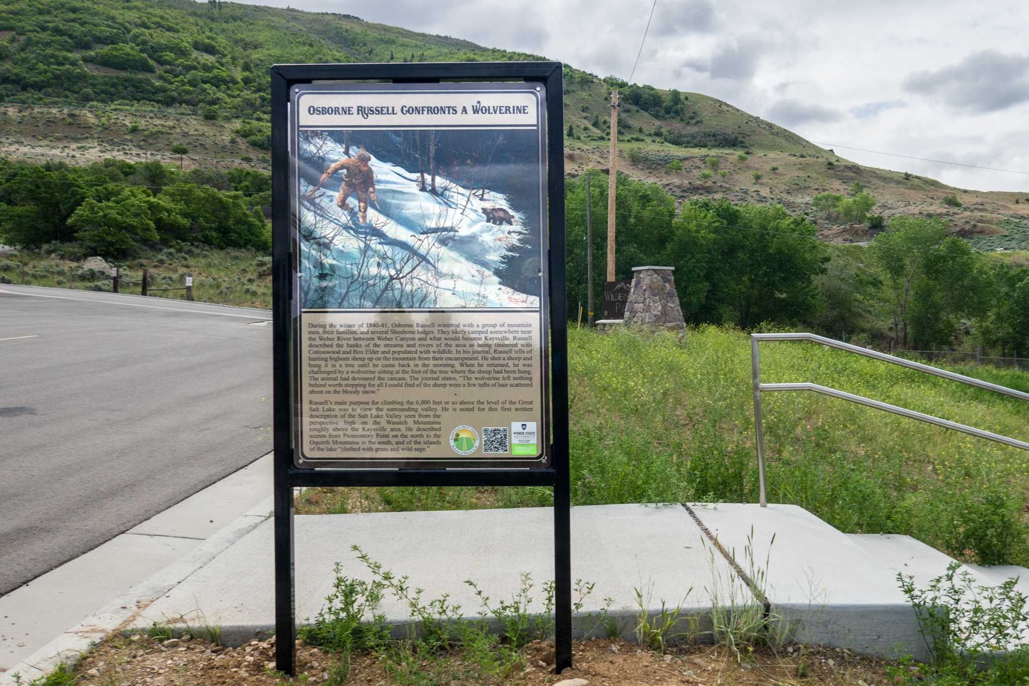 In his journal, Russell told of hunting Bighorn sheep up the mountain from the encampment. After hanging his kill in a tree, he returned to his horse for the night. Upon returning the next morning, he confronted a wolverine sitting at the foot of the tree where the sheep had hung. The animal had devoured the carcass. Russell wrote: “The wolverine left nothing behind worth stopping for… all I could find of the sheep were a few tufts of hair scattered about on the snow.”  Russell’s main purpose for climbing the 6,000 feet or so above the level of the Great Salt Lake where he hunted was to take a view of the lake water at sunrise.  He was the first European to leave a recorded description of the valley from a perspective high on the Wasatch Range roughly above the Kaysville area. He identified Promontory point to the north and the Oquirrh Mountains to the south. Of the islands in the lake, he wrote of one, “which appeared to be a mass of basaltic rock with a few scrubby cedars standing about in the cliffs. The others appeared to be clothed with grass and wild sage, but no wood except a few bushes.”