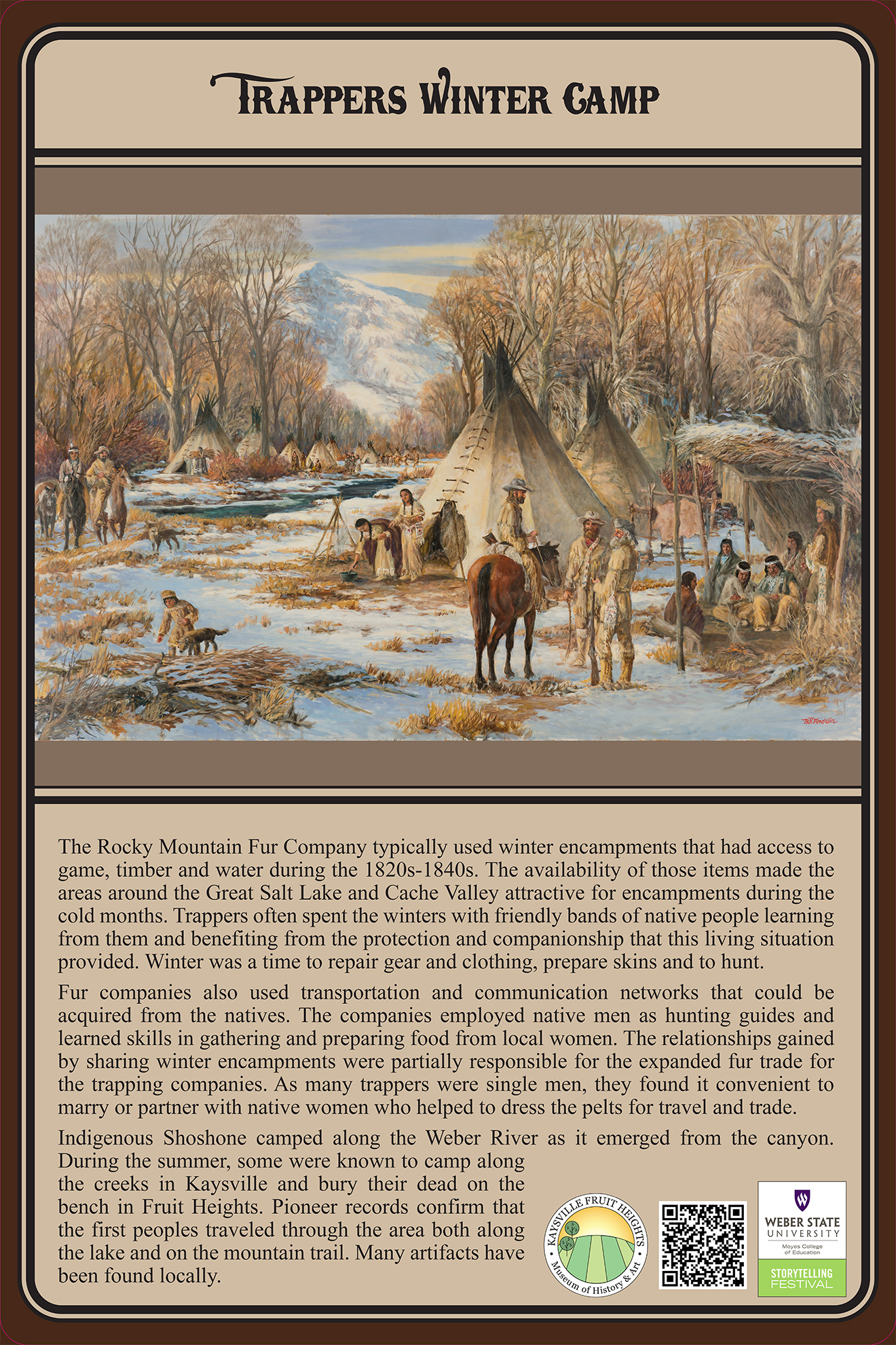 - The painting, Trappers Winter Camp created by B. Y. Andelin and commissioned for the nation’s bicentennial, is owned by the Weber State Storytelling Festival and shown by permission.